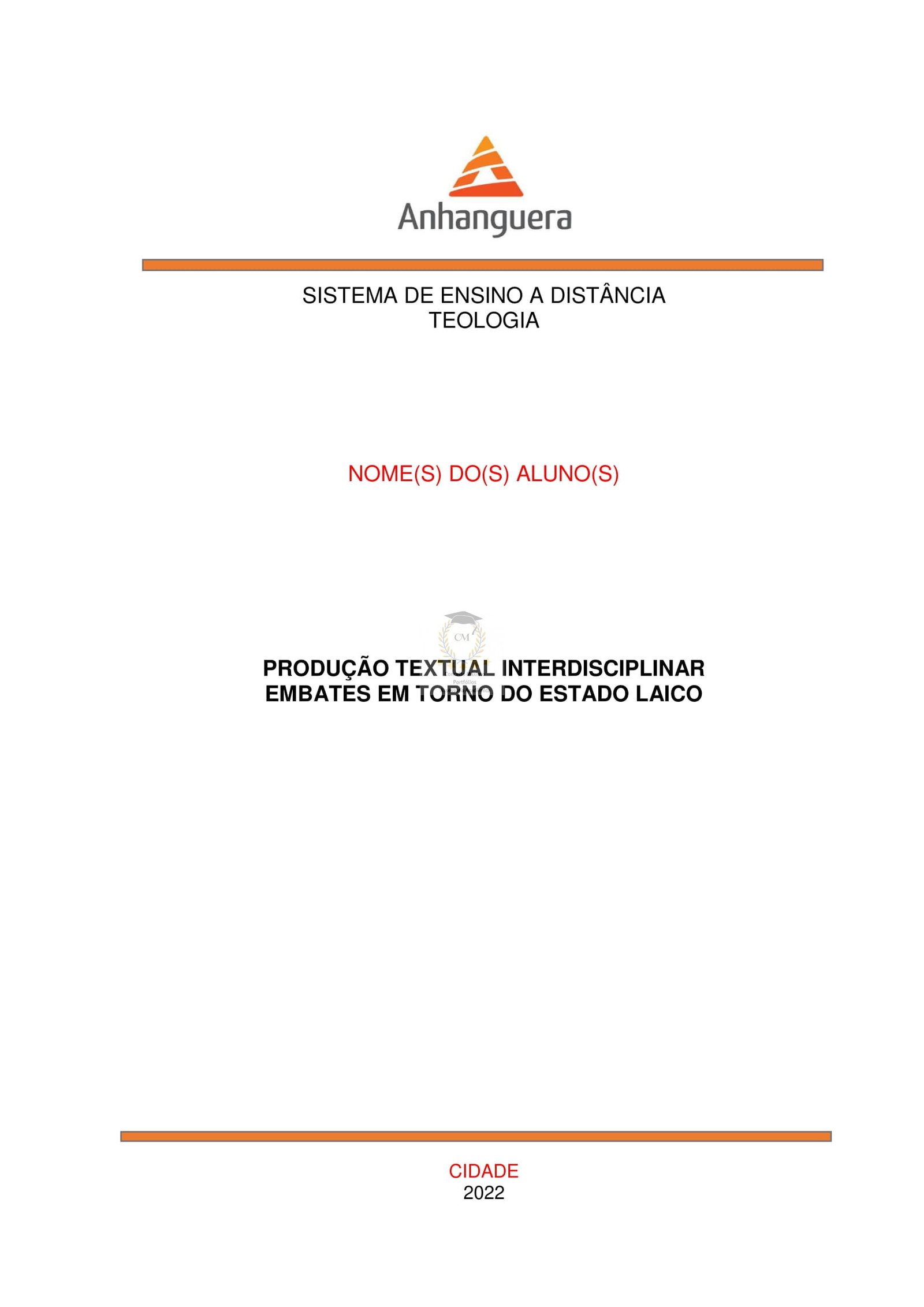 A partir do que foi apresentado, desenvolva um trabalho em um texto argumentativo dissertativo, onde, estejam presentes os fatores históricos, culturais, políticos, econômicos e religiosos que envolvam essas estruturas. Faça uma relação entre o histórico religioso do Brasil e o estabelecimento do Estado laico, utilizando como fundamentos, os elementos citados e os “embates em torno do Estado laico”. No seu trabalho, você poderá contar e seguir com os textos de apoio referenciados na proposta e o que você estudou nas Disciplinas do semestre e principalmente: siga o roteiro de perguntas elaboradas na Situação-Problema. Lembre-se sempre que é um trabalho acadêmico, científico e de própria autoria. Introdução (1 lauda) Desenvolvimento (2 a 3 laudas) Considerações finais (1 lauda) PRODUÇÃO TEXTUAL INTERDISCIPLINAR INDIVIDUAL – PTI Materiais indicados para leitura e o desenvolvimento da produção textual: D’AVILA-LEVY, Claudia Masini; CUNHA, Luiz Antônio (Orgs.). Embates em torno do Estado laico. São Paulo: SBPC, 2018. Disponível em: http://portal.sbpcnet.org.br/livro/estadolaico.pdf Acesso em: Dez. 2021. CURY, Carlos Roberto Jamil. Por uma concepção do estado laico. In: Embates em torno do Estado laico. Claudia Masini d’Avila-Levy, Luiz Antônio Cunha (Orgs.). – São Paulo: SBPC, 2018. Disponível em: http://portal.sbpcnet.org.br/livro/estadolaico.pdf Acesso em: Dez. 2021. OLIVEIRA, Fabrício Roberto Costa. Religião e participação política: considerações sobre um pequeno município brasileiro. Disponível em: https://www.ces.uc.pt/ecadernos/media/ecadernos13/02_%20Fabricio%20Oliveira.pdf Acesso em: Dez. 2021. FRANKLIN DE SOUSA, Rodrigo. Resenha “Religiosidade no Brasil”. In: Revista Estudos avançados, 27 (79). 2013. p. 285-288. Disponível em: https://www.scielo.br/j/ea/a/In/?lang=pt Acesso: 07 dez. 2021. BOSISIO, Izabella. “Religião, cultura, nação: articulações possíveis a partir de três datas comemorativas”. In: Revista Horizontes antropológicos, Porto Alegre, ano 24, n. 52. set./dez. 2018. p. 199-221. Disponível em: https://www.scielo.br/j/ha/a/xBYbdFTPDvgyYTcmVPVNJ8L/?lang=pt&format=pdf Acesso: 07 dez. 2021. CHUEIRE, LÚCIA. Religiosidades africanas e ameríndias. Curitiba: InterSaberes, 2021. [Biblioteca Virtual 3.0 Pearson] COSTA, Valéria Gomes; GOMES, Flávio. Religiões negras no Brasil: da escravidão à pósemancipação. São Paulo: Selo Negro, 2016. [Biblioteca Virtual 3.0 Pearson] ANDRADE, Marli Turetti Rabelo; RUPPELL JÚNIOR, Ivan Santos. O Cristianismo e a Civilização Ocidental: Influências culturais e movimentos históricos. Curitiba: Intersaberes, 2021. [Biblioteca Virtual 3.0 Pearson] COUTO, Jorge. A Construção do Brasil: ameríndios, portugueses e africanos, do início do povoamento a finais de Quinhentos. Rio de Janeiro: Forense. 2011. [Minha Biblioteca] ALENCAR, Flávio L. História da Igreja no Brasil. Curitiba: Intersaberes, 2019. [Biblioteca Virtual 3.0 Pearson]