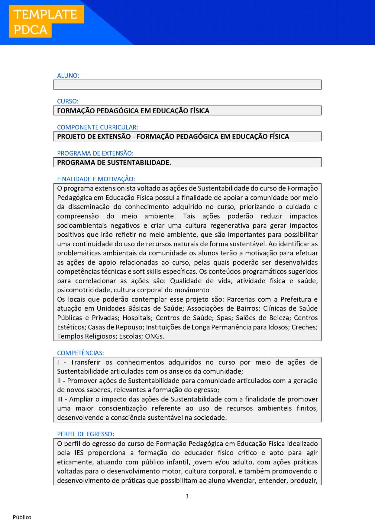 O programa extensionista voltado as ações de Sustentabilidade do curso de Formação Pedagógica em Educação Física possui a finalidade de apoiar a comunidade por meio da disseminação do conhecimento adquirido no curso, priorizando o cuidado e compreensão do meio ambiente. Tais ações poderão reduzir impactos socioambientais negativos e criar uma cultura regenerativa para gerar impactos positivos que irão refletir no meio ambiente, que são importantes para possibilitar uma continuidade do uso de recursos naturais de forma sustentável. Ao identificar as problemáticas ambientais da comunidade os alunos terão a motivação para efetuar as ações de apoio relacionadas ao curso, pelas quais poderão ser desenvolvidas competências técnicas e soft skills específicas. Os conteúdos programáticos sugeridos para correlacionar as ações são: Qualidade de vida, atividade física e saúde, psicomotricidade, cultura corporal do movimento