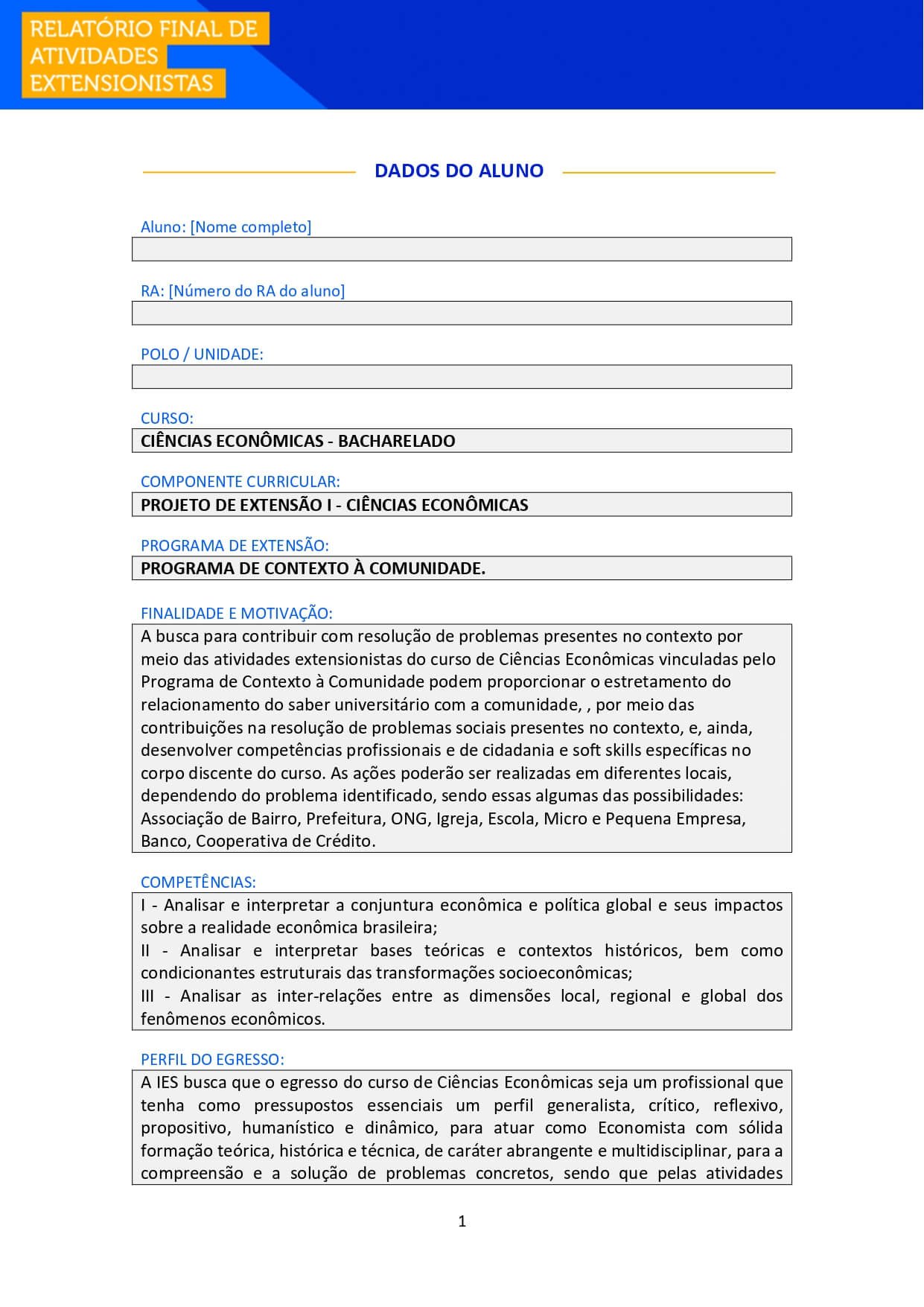 Portfólio Individual Projeto de Extensão I Ciências Econômicas O principal objetivo das atividades extensionistas do curso de Ciências Econômicas, vinculadas ao Programa de Contexto à Comunidade, é o novo saber gerado pela aplicação do conhecimento adquirido no curso que ocorre durante a busca da contribuição à resolução de problemas contextuais à sociedade, e, ainda, ao desenvolvimento social e da melhoria da qualidade de vida, dessa forma, oportunizando que o corpo discente realize ações a partir de sua aprendizagem multidisciplinar adquirida no curso.