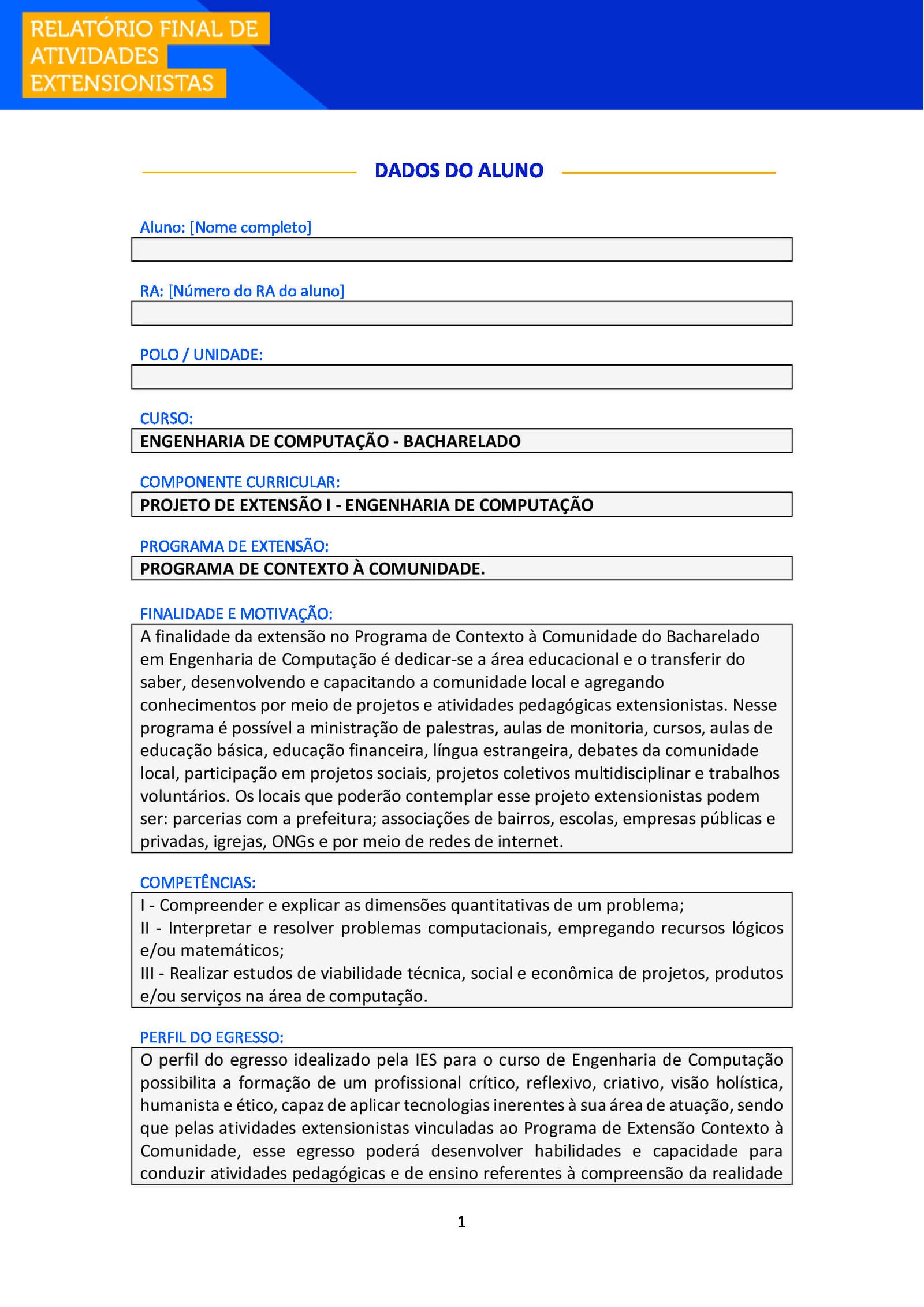 Aluno e Aluna, após realizar suas atividades de extensão, é necessário que você o formalize, enviando esse Relatório Final para ser avaliado junto ao seu Ambiente Virtual (AVA) e também para você poder comprovar sua atuação.