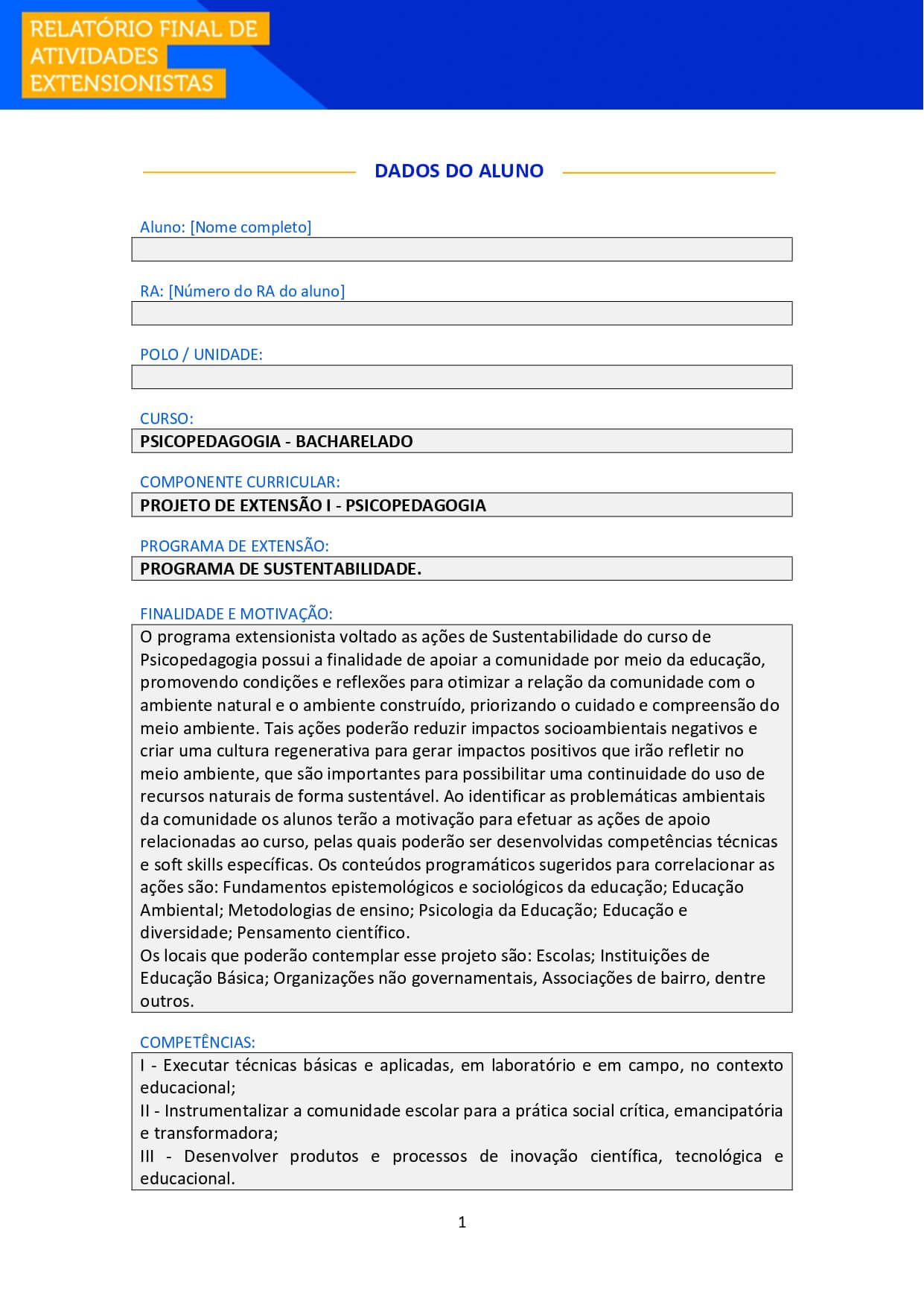 | Aluno e Aluna, após realizar suas atividades de extensão, é necessário que você o formalize, enviando esse Relatório Final para ser avaliado junto ao seu Ambiente Virtual (AVA) e também para você poder comprovar sua atuação.Para o preenchimento, busque as anotações junto ao TEMPLATE PCDA para auxiliar na apresentação das atividades desenvolvidas. Todos os campos são de preenchimento obrigatório! | ||||||||||