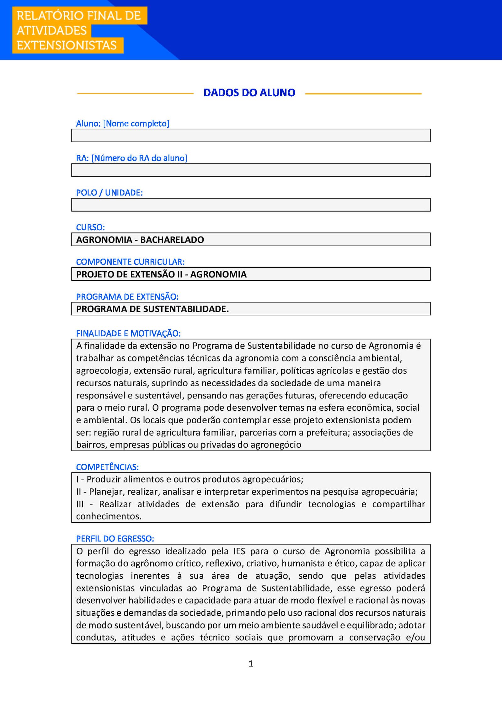 Aluno e Aluna, após realizar suas atividades de extensão, é necessário que você o formalize, enviando esse Relatório Final para ser avaliado junto ao seu Ambiente Virtual (AVA) e também para você poder comprovar sua atuação.