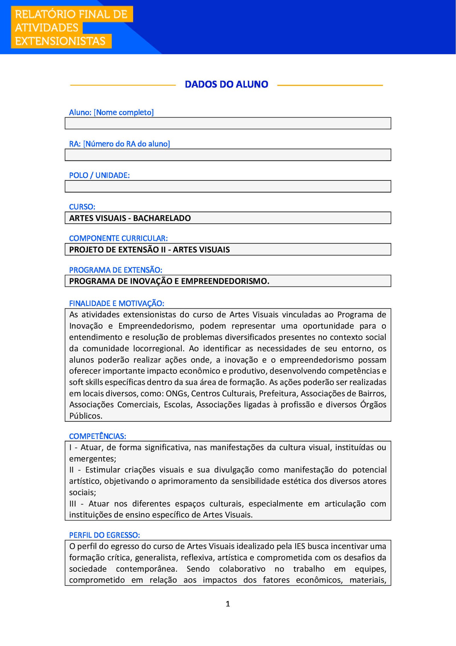 | Aluno e Aluna, após realizar suas atividades de extensão, é necessário que você o formalize, enviando esse Relatório Final para ser avaliado junto ao seu Ambiente Virtual (AVA) e também para você poder comprovar sua atuação. Para o preenchimento, busque as anotações junto ao TEMPLATE PCDA para auxiliar na apresentação das atividades desenvolvidas. Todos os campos são de preenchimento obrigatório! | ||||||||||