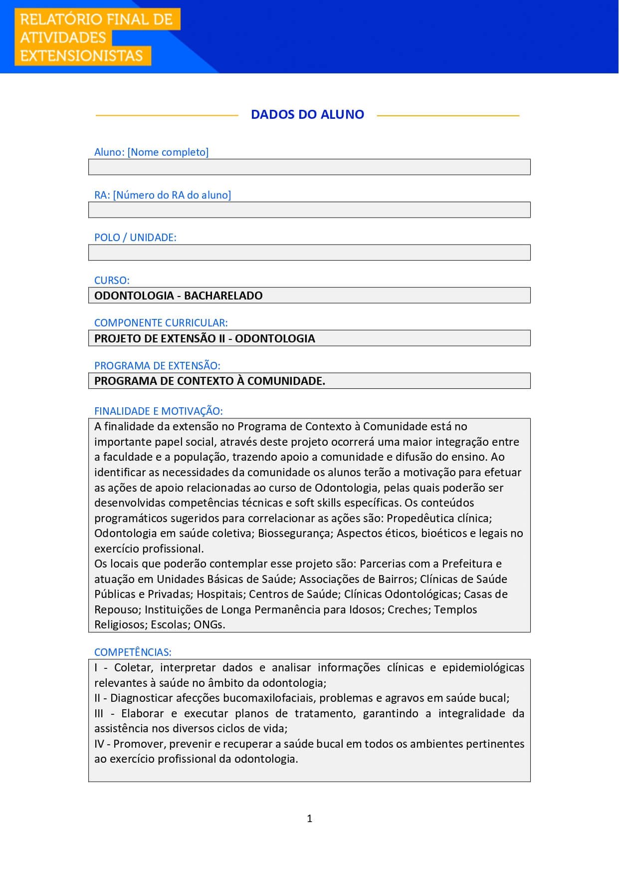 Aluno e Aluna, após realizar suas atividades de extensão, é necessário que você o formalize, enviando esse Relatório Final para ser avaliado junto ao seu Ambiente Virtual (AVA) e também para você poder comprovar sua atuação.