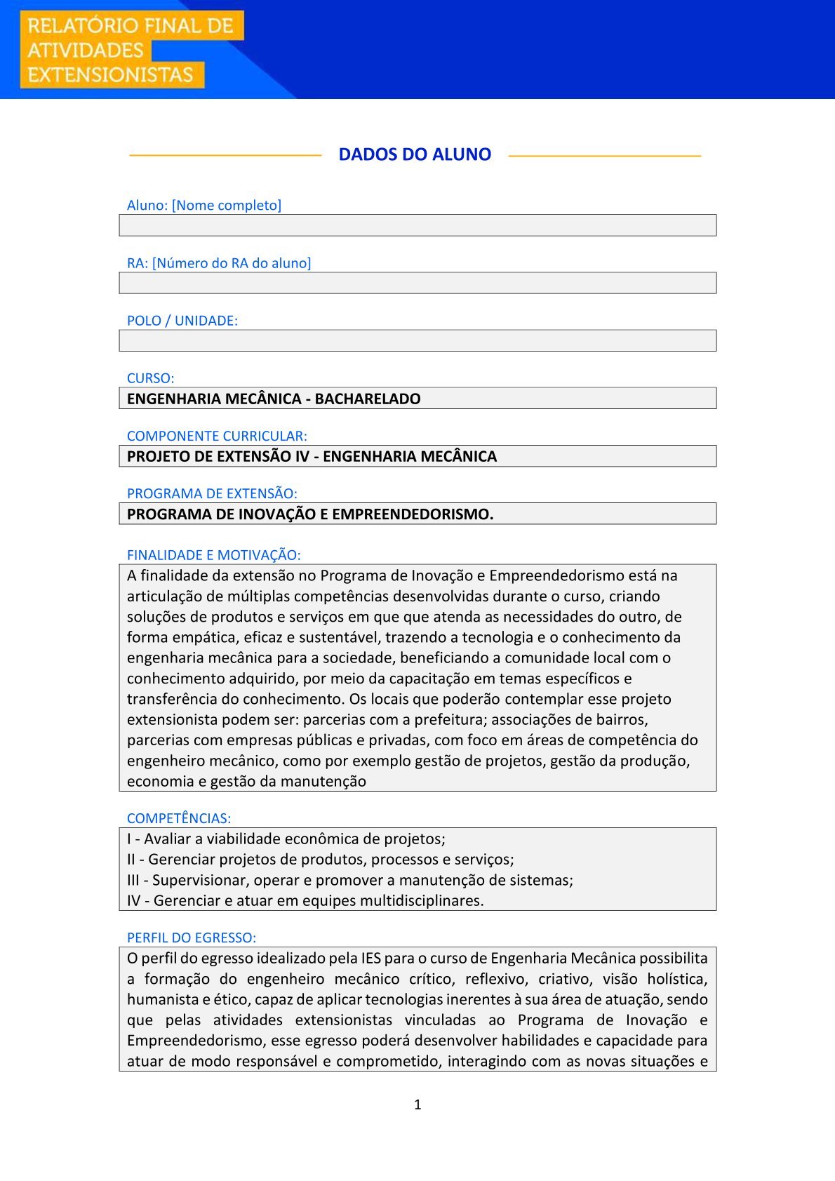 A finalidade da extensão no Programa de Inovação e Empreendedorismo está na articulação de múltiplas competências desenvolvidas durante o curso, criando soluções de produtos e serviços que atendam às necessidades do outro, de forma empática, eficaz e sustentável, trazendo a tecnologia e o conhecimento da engenharia mecânica para a sociedade, beneficiando a comunidade local com o conhecimento adquirido, por meio da capacitação em temas específicos e transferência do conhecimento.